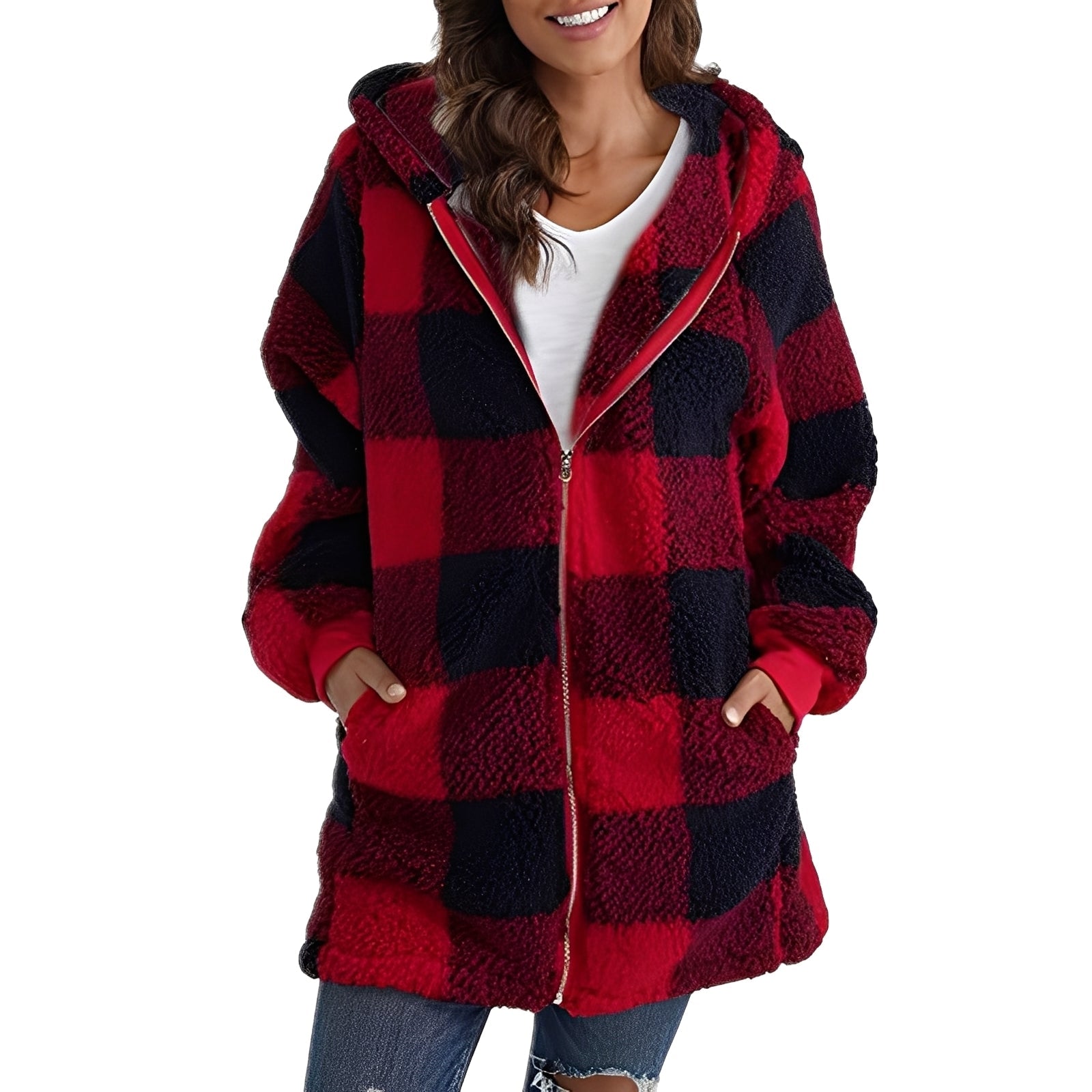 The "Desirae" cardigan combines relaxed style with functional warmth. The soft, warm material offers high comfort, while the classic checkered pattern adds a modern touch to your outfit. The practical hood provides extra protection from wind and cold – ideal for walks, leisure time, or relaxed days in the city.