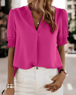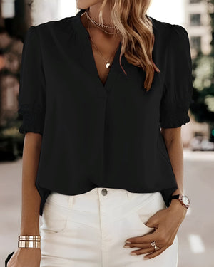 The 'Amanda' blouse is distinguished by its elegant design and comfortable, airy feel. The short sleeves are ideal for sunny days, and the feminine design adds a stylish touch to any outfit. Whether at work, exploring the city, or attending special events, this blouse provides endless styling possibilities. A timeless piece for any situation.
