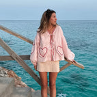 Μπλούζα για γυναίκες με μοτίβο gingham, χαλαρή γραμμή, βολάν και κλείσιμο με κόκκινο μπροστά. Αυτή η πολυλειτουργική μπλούζα συνδυάζει άνεση και παιχνιδιάρικη κομψότητα.