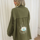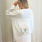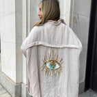 Ανακαλύψτε το απόλυτο καλοκαιρινό στυλ με το Γυναικείο Κιμονό – Oversize Κόψιμο – Ελαφρύ Βέλο – Σχέδιο Κεντημένο Μάτι. Αυτό το ελαφρύ και άνετο κιμονό με κεντημένο σχέδιο μάτι στην πλάτη προσθέτει μια μποέμ και μυστικιστική πινελιά σε κάθε εμφάνιση.