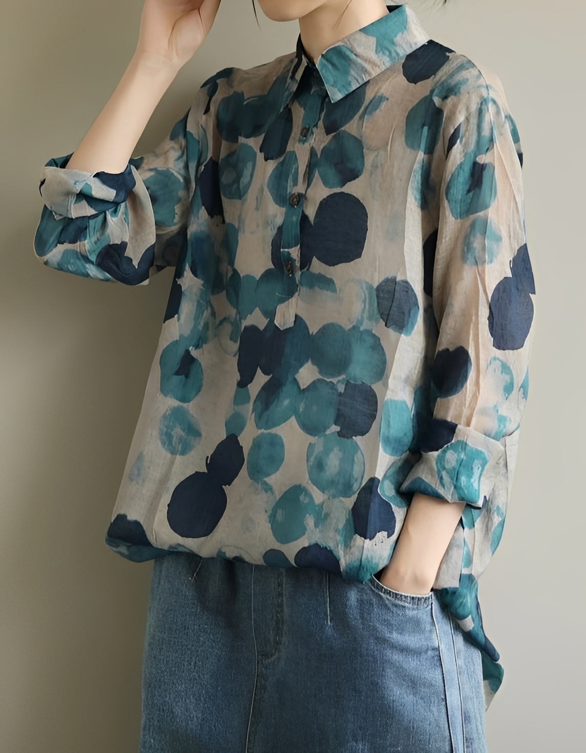 This fashionable blouse merges classic sophistication with a modern, laid-back feel. The polka dot design adds a subtle feminine touch, while the collar maintains its sophistication. Its relaxed fit offers comfortmenmaking it ideal for both everyday use and special occasions. The lightweight fabric is perfect for transitioning between seasons. Versatile – fits both casual and formal settings.