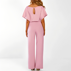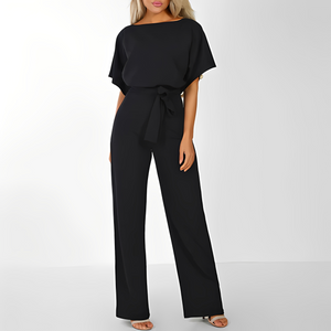 This women's jumpsuit Kelsy is crafted to provide a stylish and convenient outfit in a single piece, no matter the event. Its short sleeves make it airy and comfy, making it a perfect pick for daily wear or special occasions. The wide-leg pants offer a flowing silhouette that adds elegance and ease of movement. A tie belt lets you customize the fit for a more defined and appealing silhouette. Modern and adaptable, this jumpsuit is suitable for casual wear, events, or sophisticated evenings.