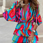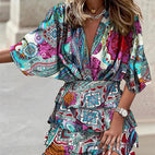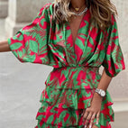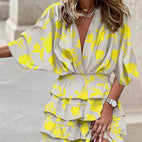 Φόρεμα για Γυναίκες – V Ντεκολτέ – Λουλουδάτο Μοτίβο – Βολάν – Νυχτερίδες Μανίκια – Ελαστική Μέση: Ανακαλύψτε αυτό το κομψό φόρεμα με ένα υπέροχο λουλουδάτο μοτίβο, ένα κολακευτικό V ντεκολτέ, παιχνιδιάρικα βολάν και άνετα νυχτερίδες μανίκια.
