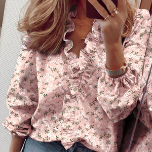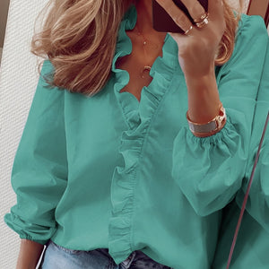 This chic ruffle blouse stands out with its timeless V-neck and carefully crafted ruffle accents. The long sleeves add sophistication, while the lightweight, draping material provides comfort. Perfect for work, daily wear, or occasions needing a polished appearance. The blouse pairs easily with pants or skirts and is a stylish must-have for fashion-forward women.