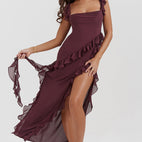 Turn heads with the Couture-Moda women's maxi dress – Adjustable straps – Ruffle detail – High slit – Elegant fit. This stunning maxi dress features adjustable shoulder straps, an elegant high slit, and playful asymmetrical ruffle details for a feminine silhouette.
