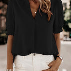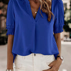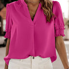 Η Sophia – Μπλούζα με V-Λαιμόκοψη και Κοντά Μανίκια είναι η τέλεια επιλογή για να συμπληρώσετε την γκαρνταρόμπα σας με ένα στυλάτο και ευέλικτο ρούχο. Κατασκευασμένη από υψηλής ποιότητας σιφόν και πολυεστέρα, προσφέρει άνεση, διαπνοή και κομψότητα. Η χαλαρή γραμμή της και ο προσεγμένος σχεδιασμός την καθιστούν ιδανική για το γραφείο καθώς και για χαλαρές περιστάσεις. Ένα πρακτικό και μοντέρνο must-have που ταιριάζει σε κάθε εποχή.